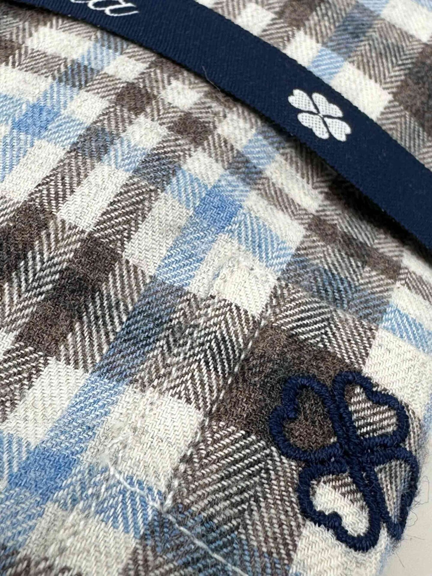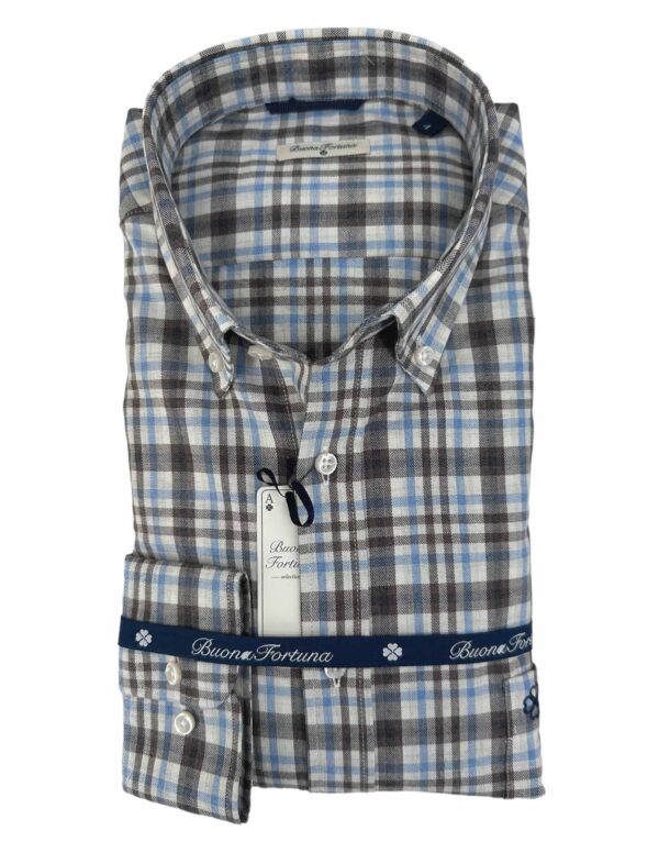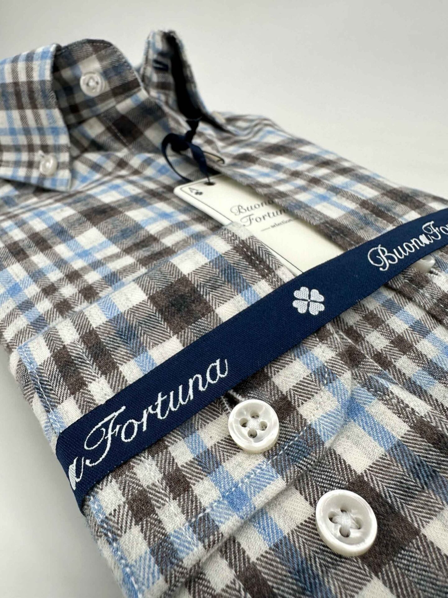 Camisa de cuadros marrones, azul celeste y crudo, tejido cálido de invierno, para vestir un look sport y cómodo, ideal para combinar con prendas azul marino, gama de marrones o de colores claros, confeccionada en un tejido de vielha espigado, con un acabado suavizado.