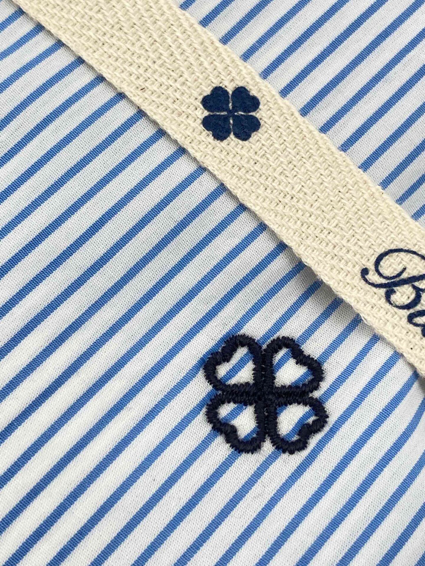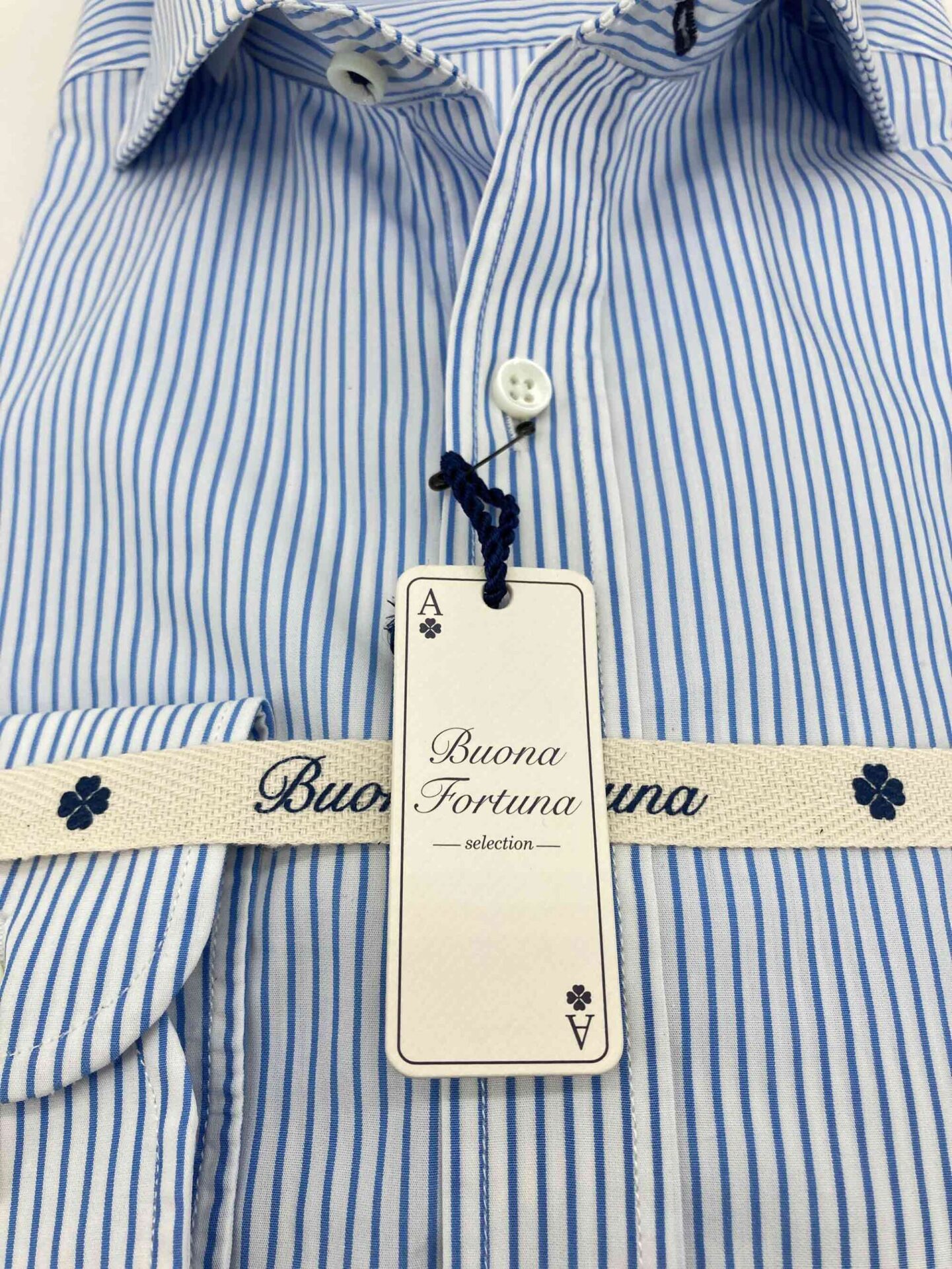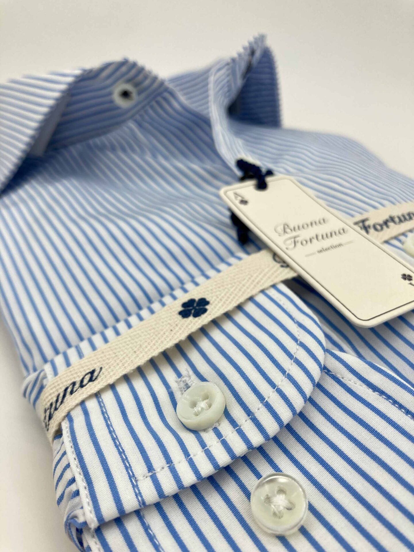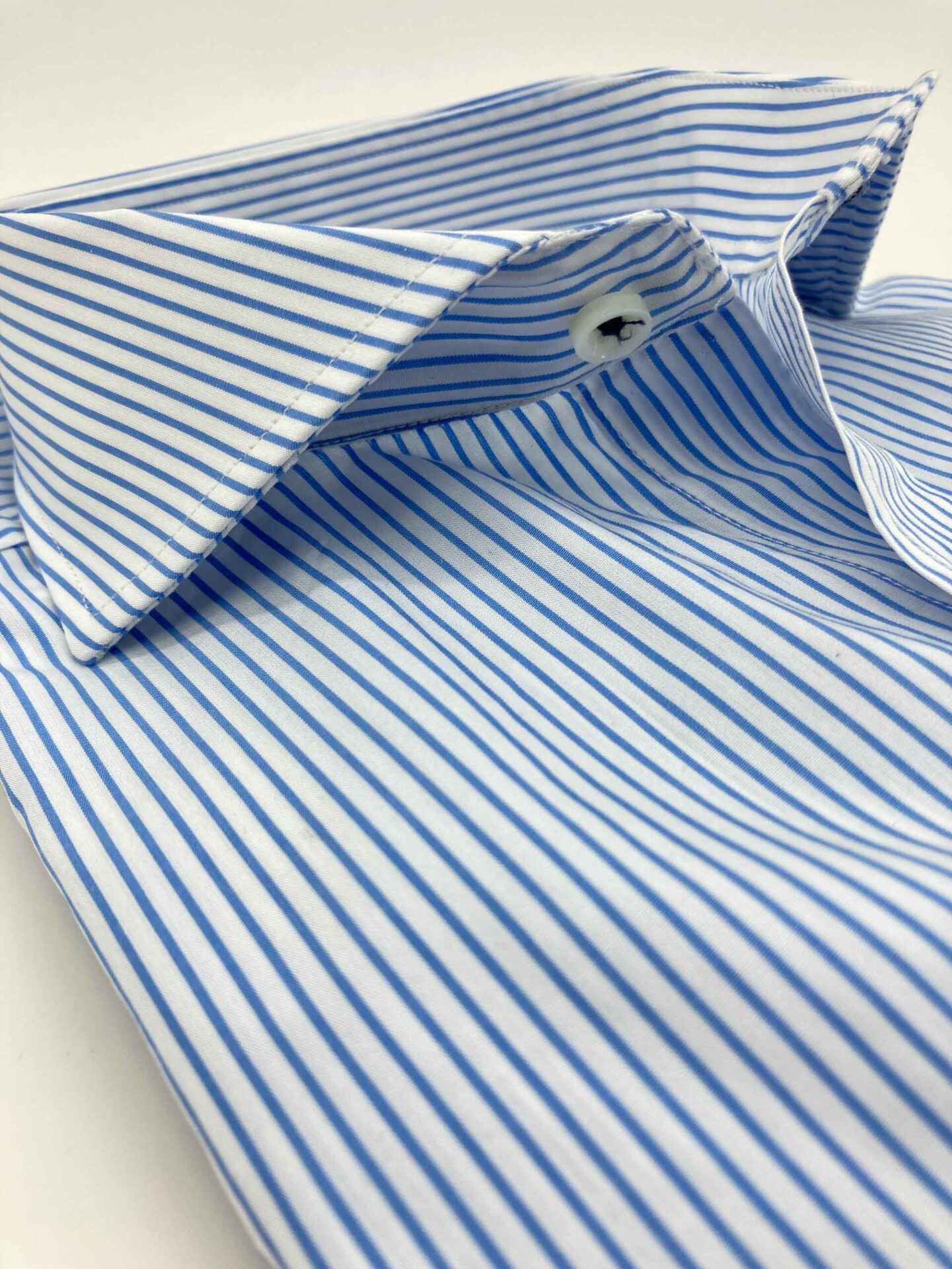 Camisa de rayas azules, tipo candela. Camisa de doble uso, se utiliza tanto para vestir como para sport.