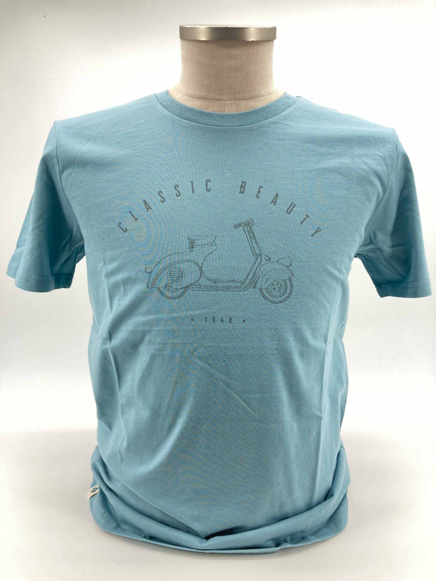 Camiseta confeccionada en 100% algodón orgánico, color azul celeste, con estampación a contraste color gris de la emblemática Vespa de 1948.