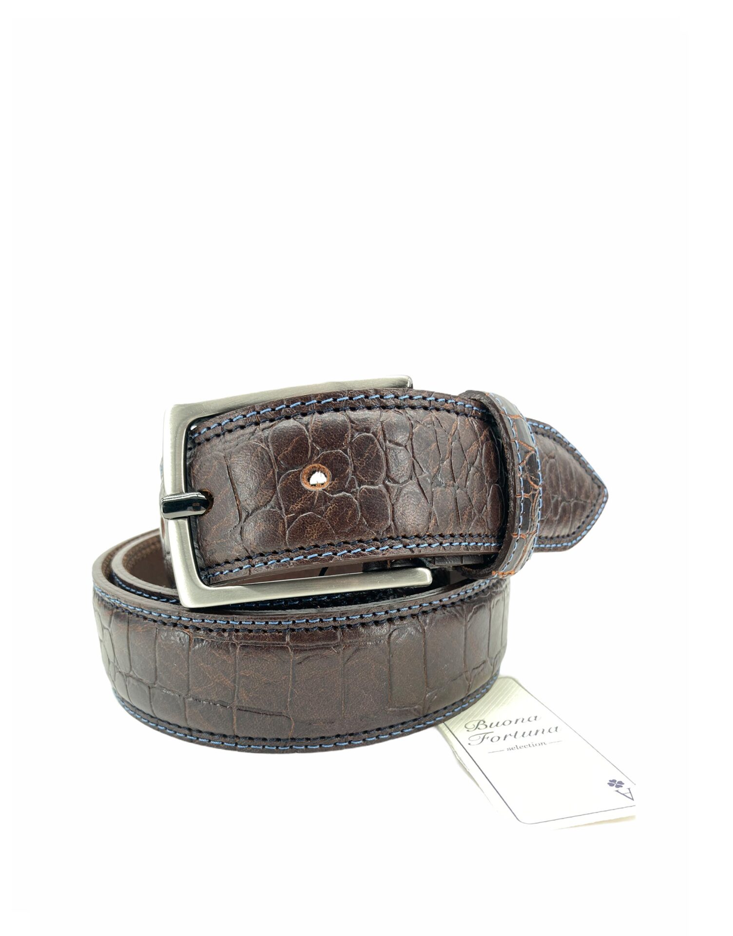 Cinturón de piel de ternera con impresión de cocodrilo, cosido lateral con hilo en azul celeste, un sport elegante de diseño atemporal.