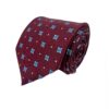 Corbata de seda italiana, confeccionada en tejido de twill color burdeos, estampada con dibujos corbateros en azul celeste. Ideal para combinar con camisa azul celeste o blanca, clásico y muy elegante.