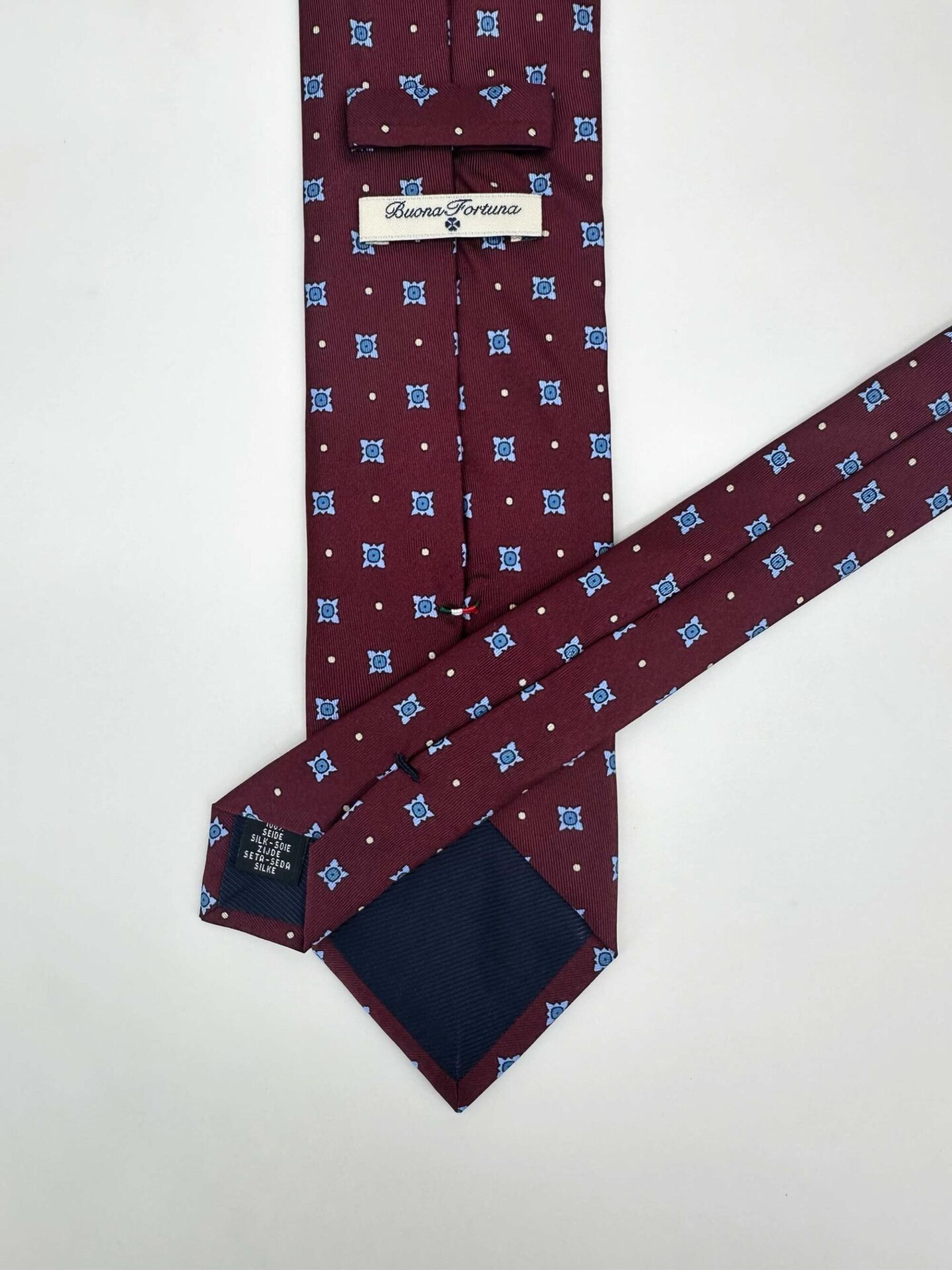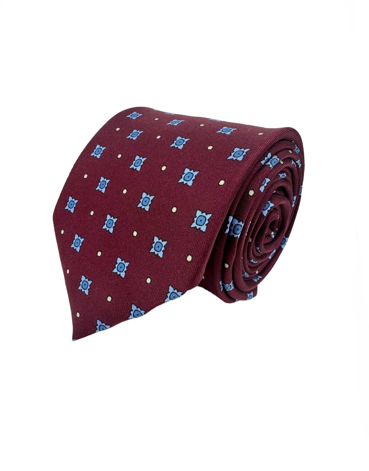 Corbata de seda italiana, confeccionada en tejido de twill color burdeos, estampada con dibujos corbateros en azul celeste. Ideal para combinar con camisa azul celeste o blanca, clásico y muy elegante.