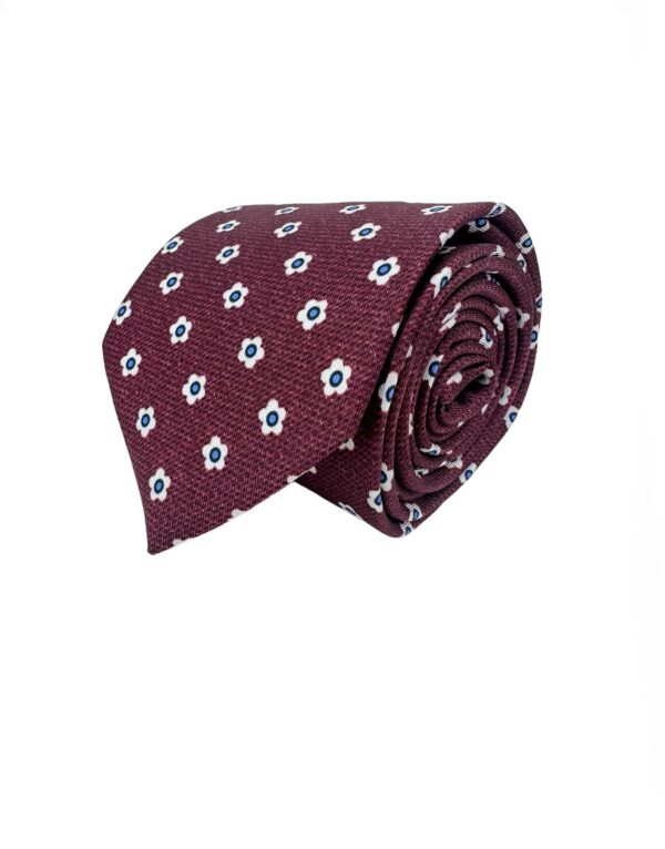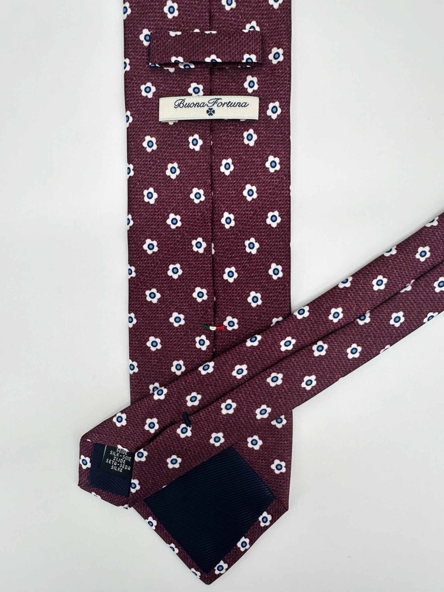 Corbata de seda italiana, confeccionada en tejido de twill color burgundy, estampada con flores blancas y celestes. Ideal para combinar con camisa blanca o celeste.