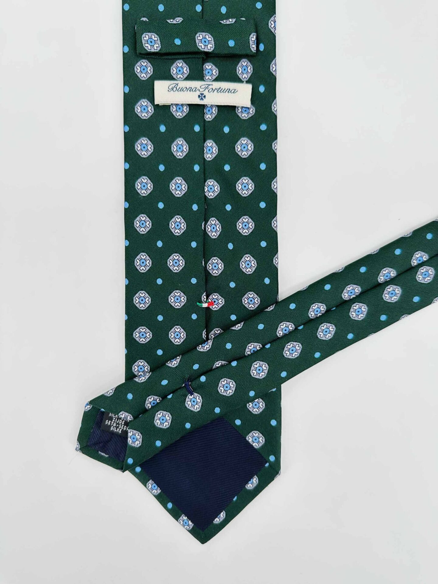 Corbata de seda italiana, confeccionada en tejido de twill color verde, hexágonos piedra y topos color celeste.