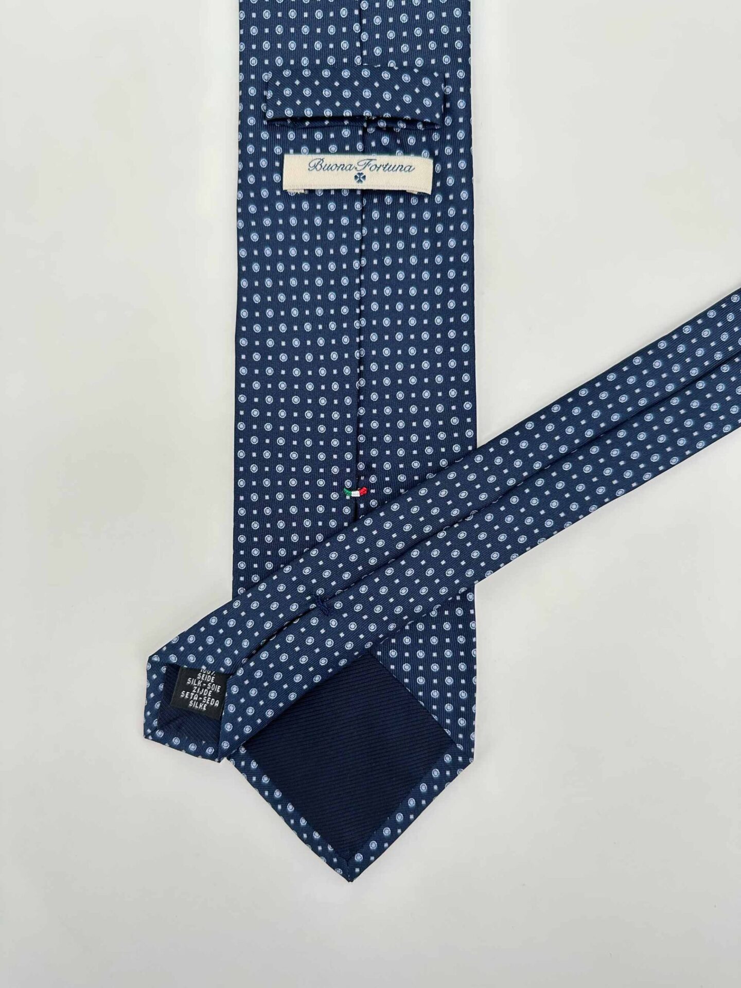 Corbata de seda italiana, confeccionada en tejido de twill color marino y óvalos azules. Para combinar tanto con camisa blanca como con azul celeste.