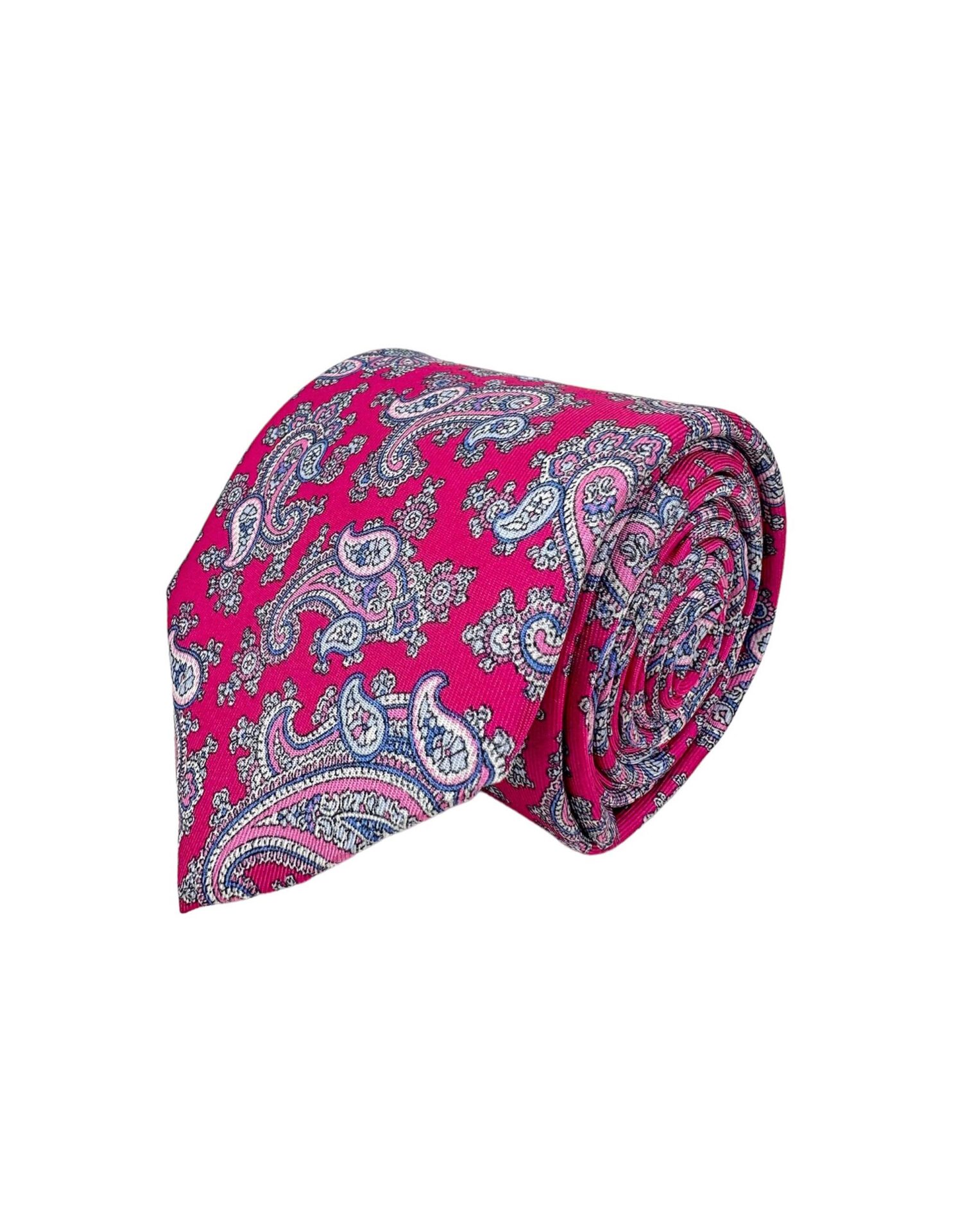 Corbata de seda italiana, confeccionada en tejido de twill color rosa fresa estampada con paramecios azules y rosa nudé.