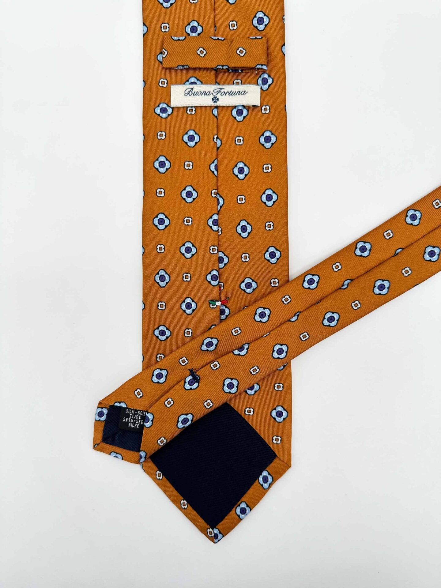 Corbata de seda italiana, confeccionada en tejido de twill color teja con flores azul celeste.