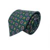 Corbata de seda italiana, confeccionada en tejido de twill color verde estampada con motivos que recuerdan a las ruedas de los vehículos en celeste y oro. Ideal para combinar con camisa azul celeste y blanca. Atrevido y divertido.