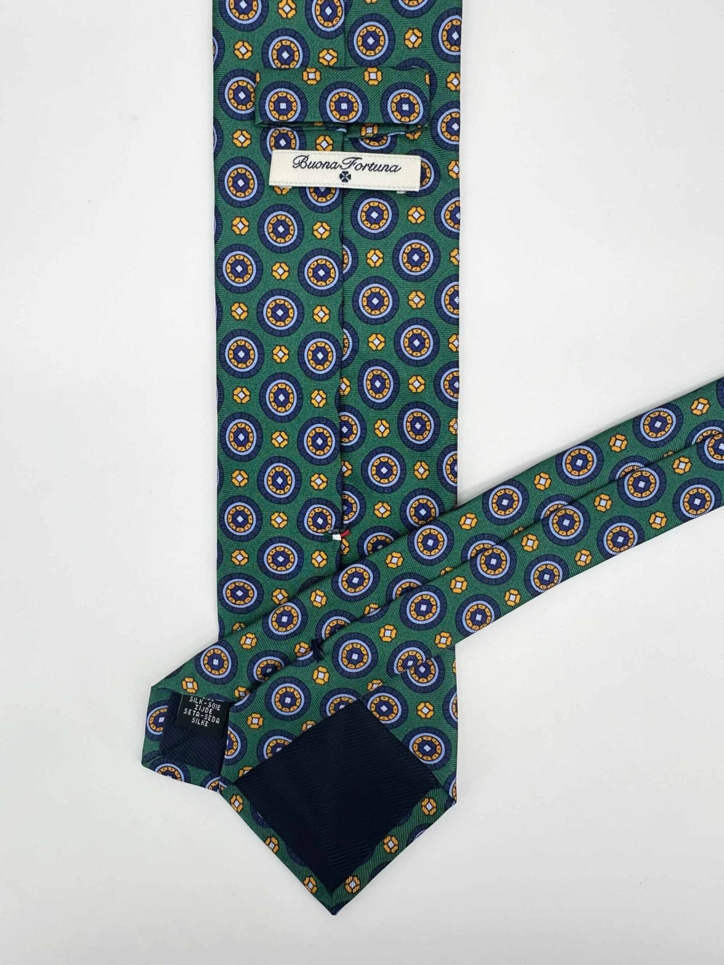 Corbata de seda italiana, confeccionada en tejido de twill color verde estampada con motivos que recuerdan a las ruedas de los vehículos en celeste y oro. Ideal para combinar con camisa azul celeste y blanca. Atrevido y divertido.
