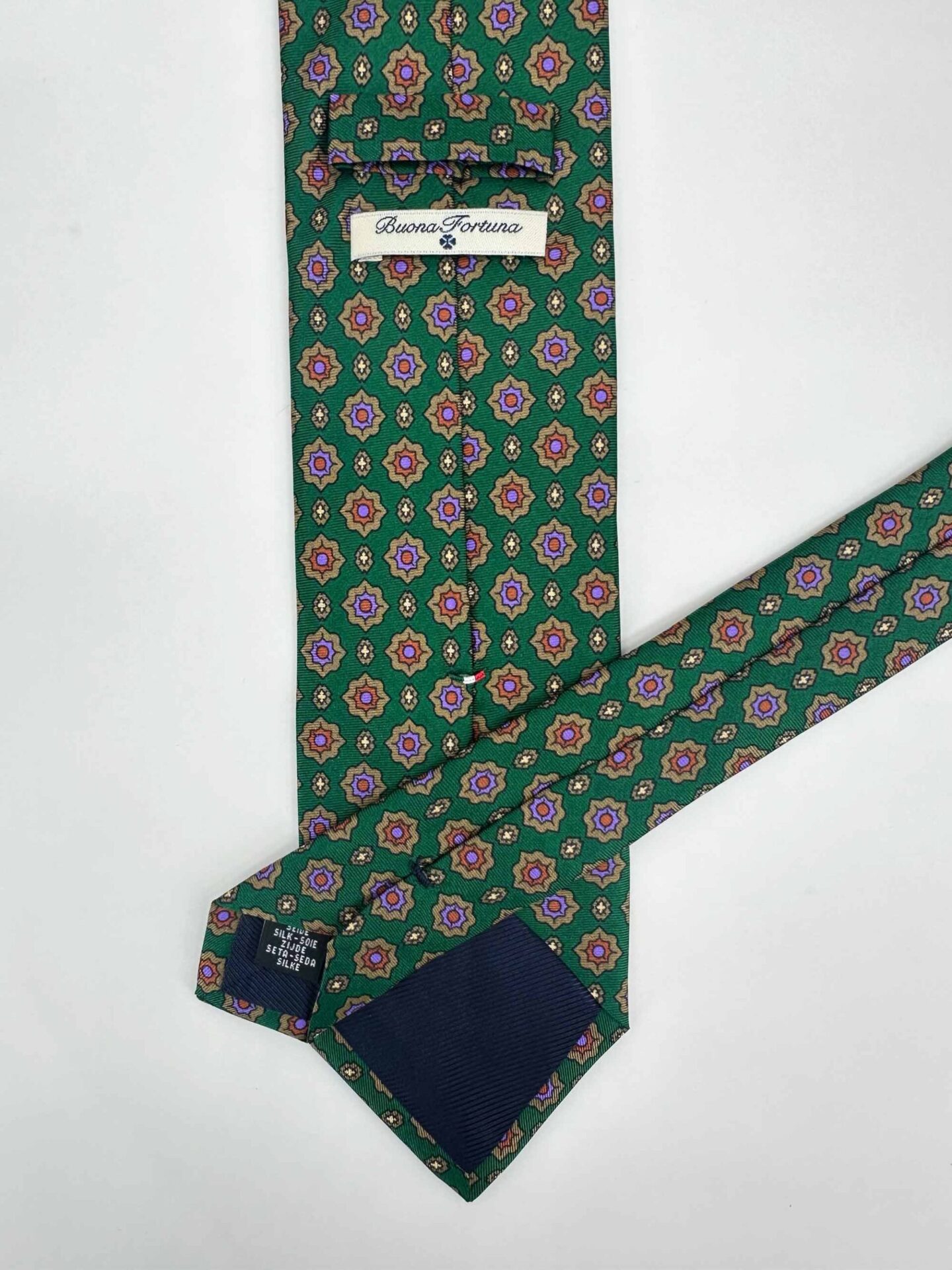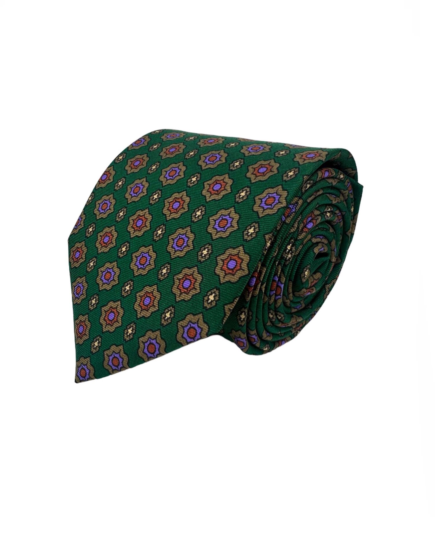 Corbata de seda italiana, confeccionada en tejido de twill color verde, estampada con dibujos corbateros en malva y tostado. Ideal para combinar con camisa azul celeste, blanca, rayas…. Dale personalidad a tú combinación.