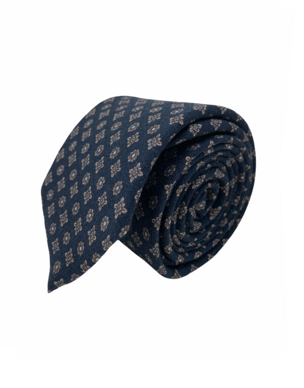 Corbata tejida de lana, fondo azul marino, estampada con dibujos de aires romanos gris y camel. Elegante y fácilmente combinable.