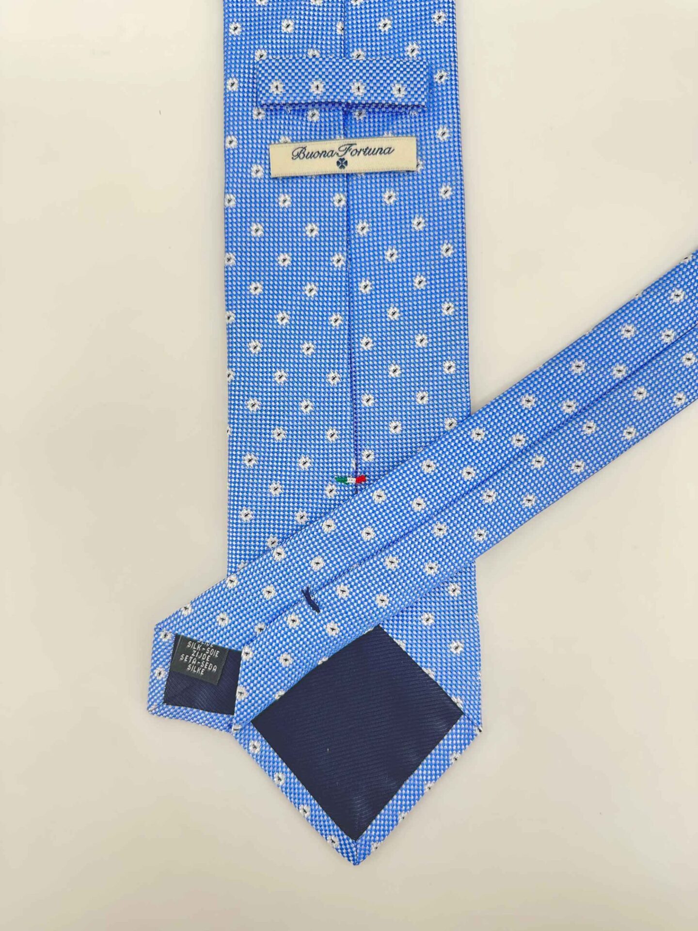 Corbata tejida en dibujo labrado color azul celeste y blanco, pequeños óvalos bordados en blanco y azul marino, ideal para combinarla con camisa blanca, perfecta para traje y para chaqué.