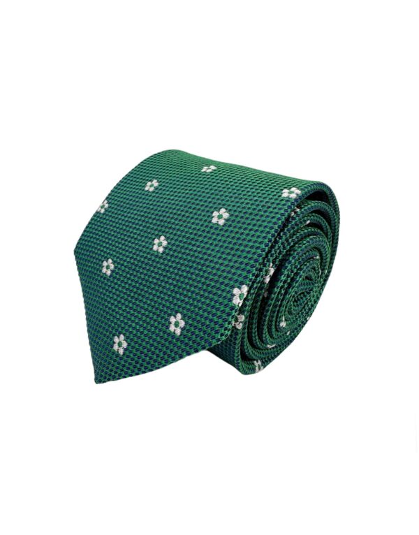 Corbata tejida en dibujo labrado verde y azul y flores tipo margaritas en blanco, ideal para combinarla con camisa blanca, perfecta para traje y para chaqué.
