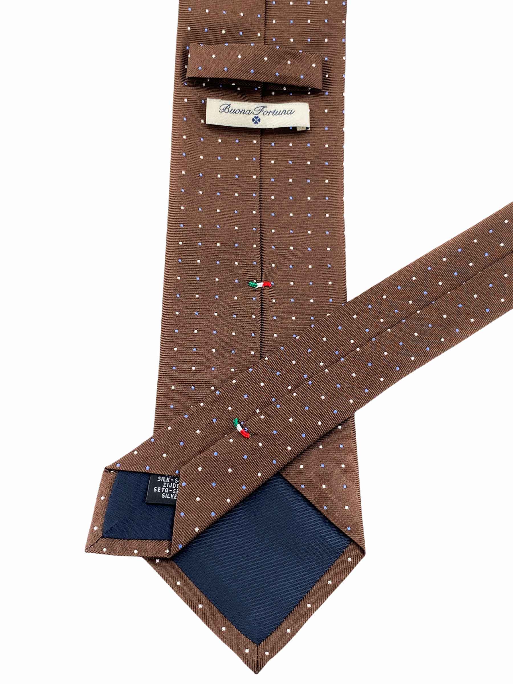 Corbata tejida fondo marrón mini topo celeste y blanco.