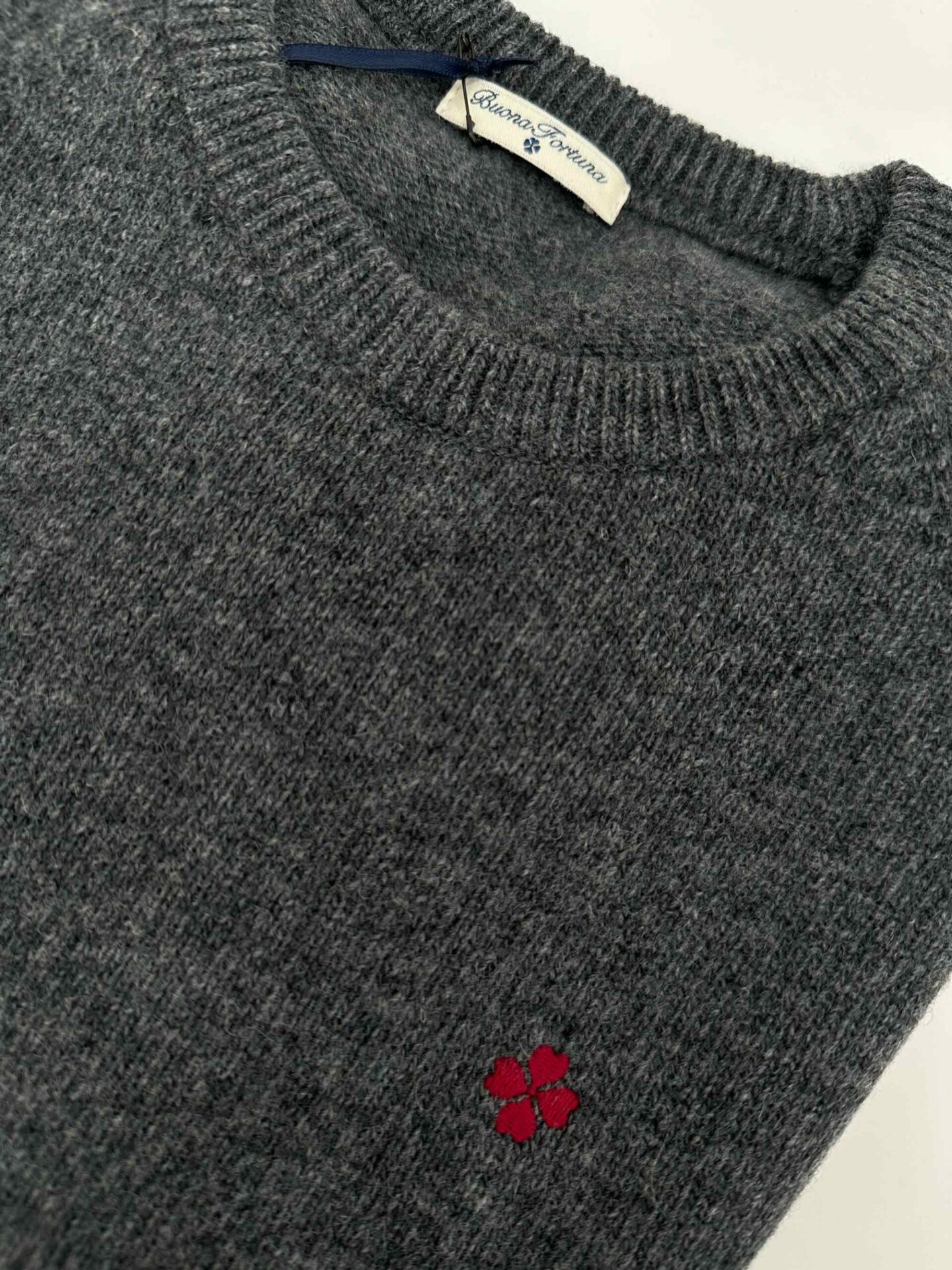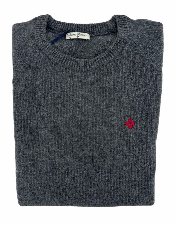 Jersey cuello caja de lana Lambswooll, color gris marengo y logo rojo cereza, combina genial con pantalones jeans, chinos azul marino, beig, camisas blancas… un básico en la colección de Buona Fortuna.