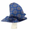 Pañuelo estampado fondo azul con pentágonos y circunferencias marrones.