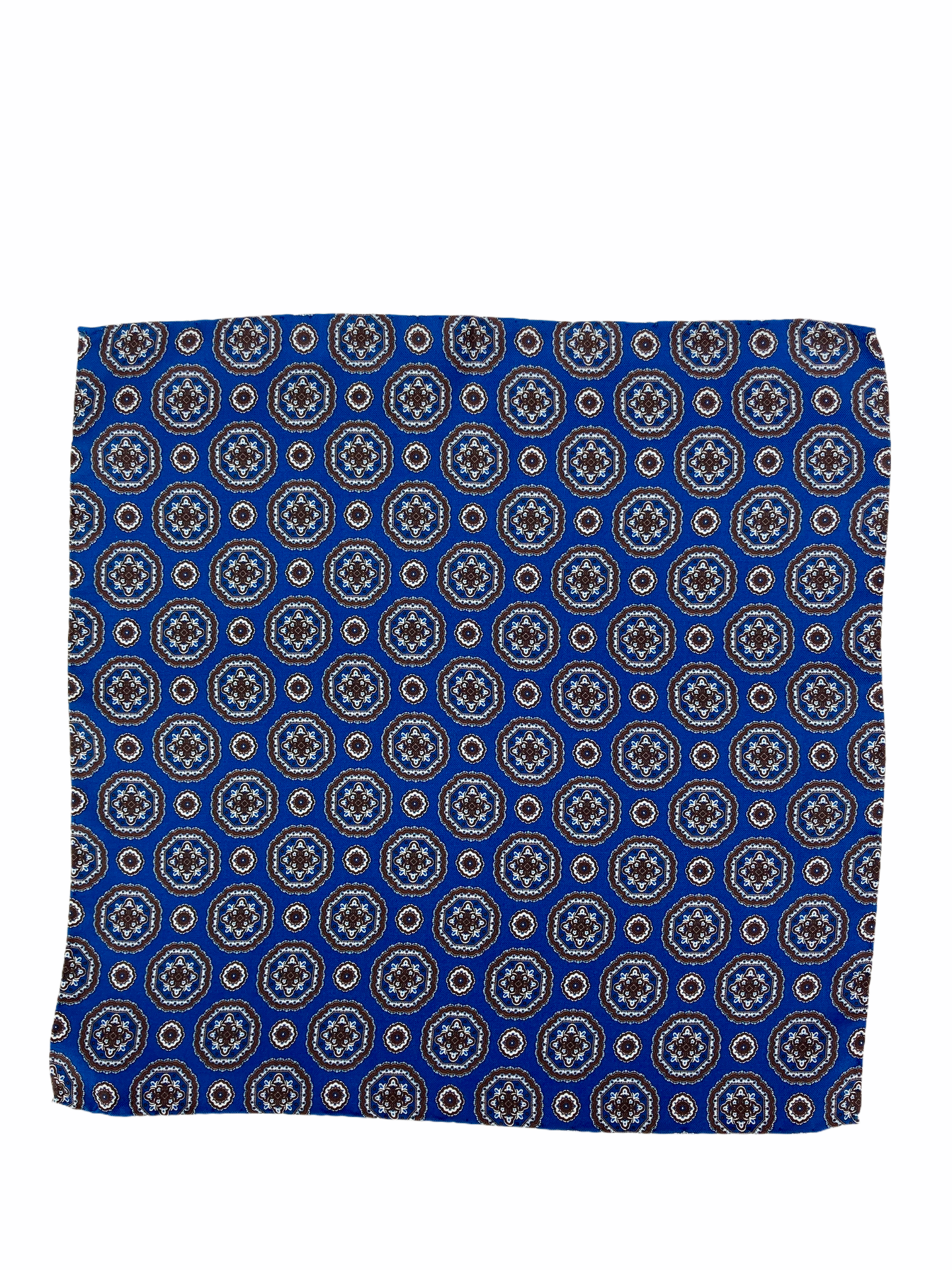 Pañuelo estampado fondo azul con pentágonos y circunferencias marrones.