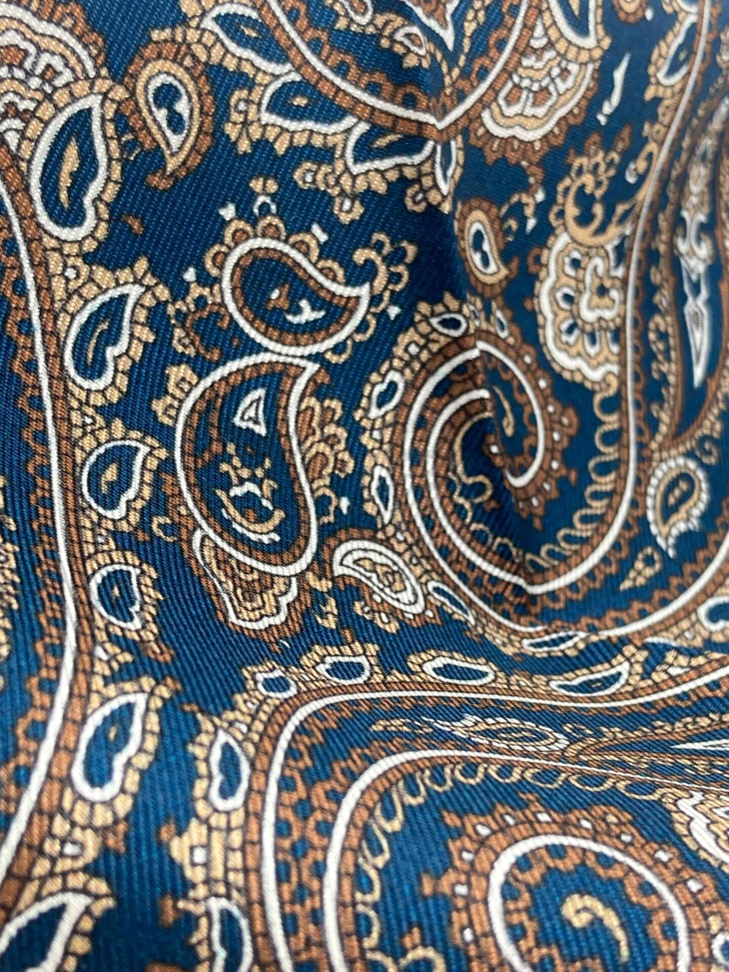 Pañuelo estampado de fondo azul marino y cashmeres camel.