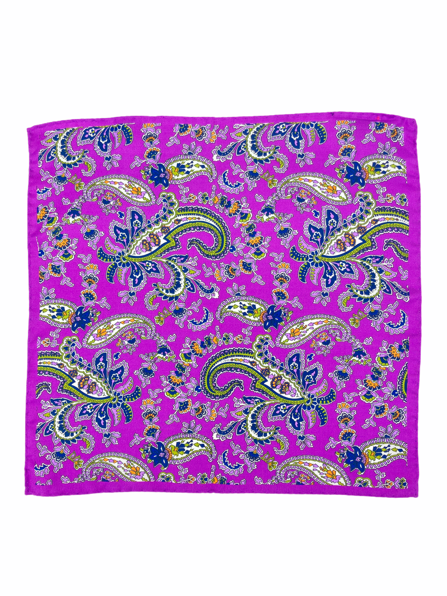 Pañuelo estampado en fondo viola con cashmeres azul, verde y blanco.