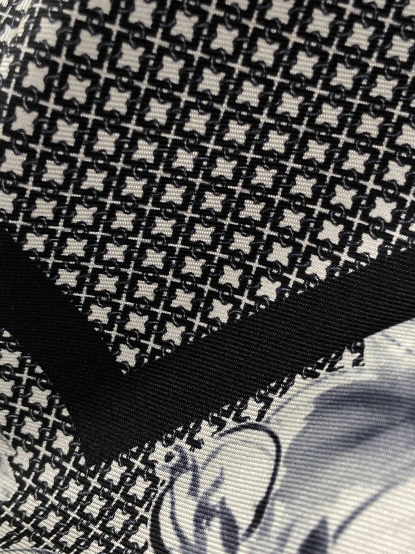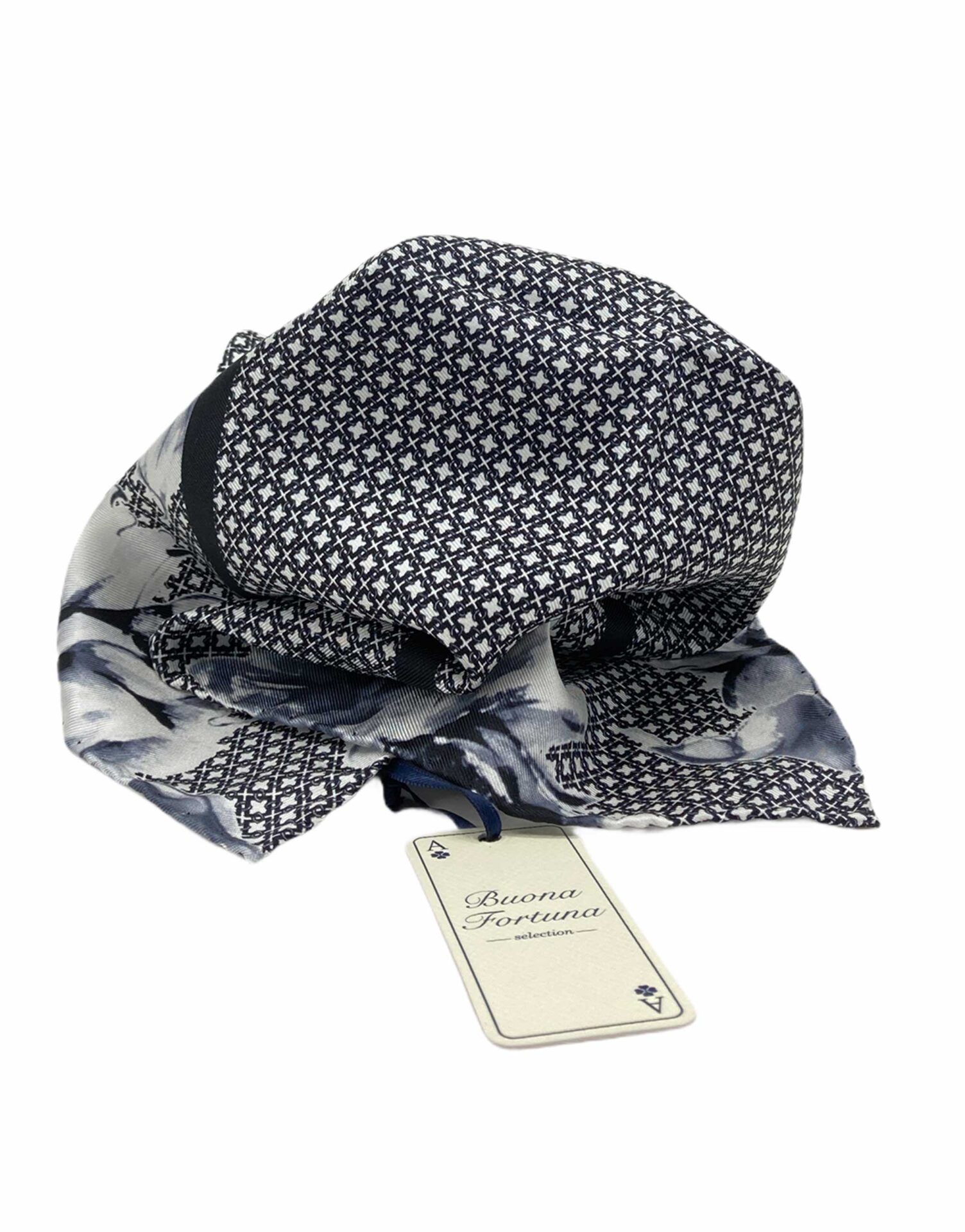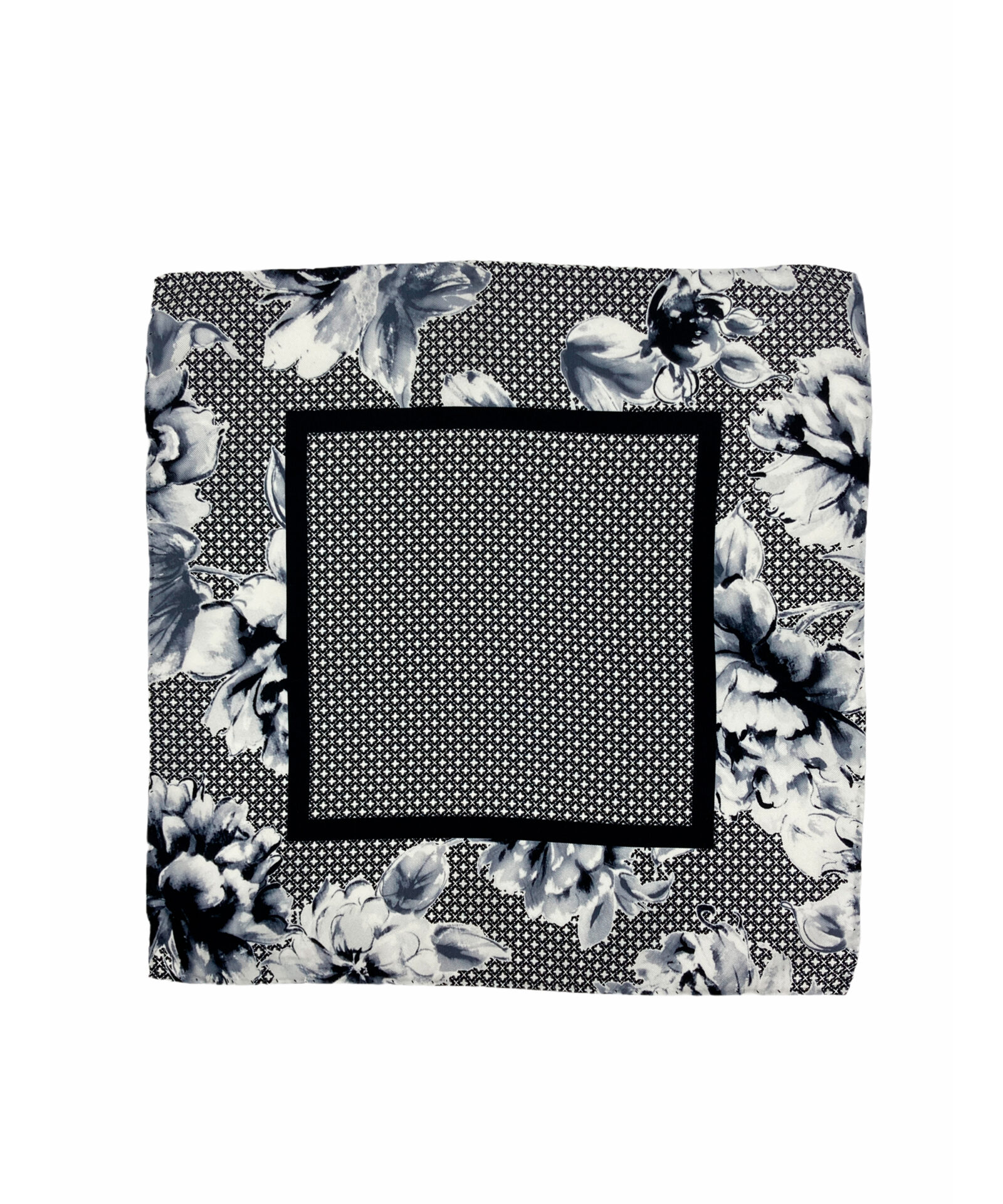 Pañuelo estampado con estrellas y flores blancas y negras.
