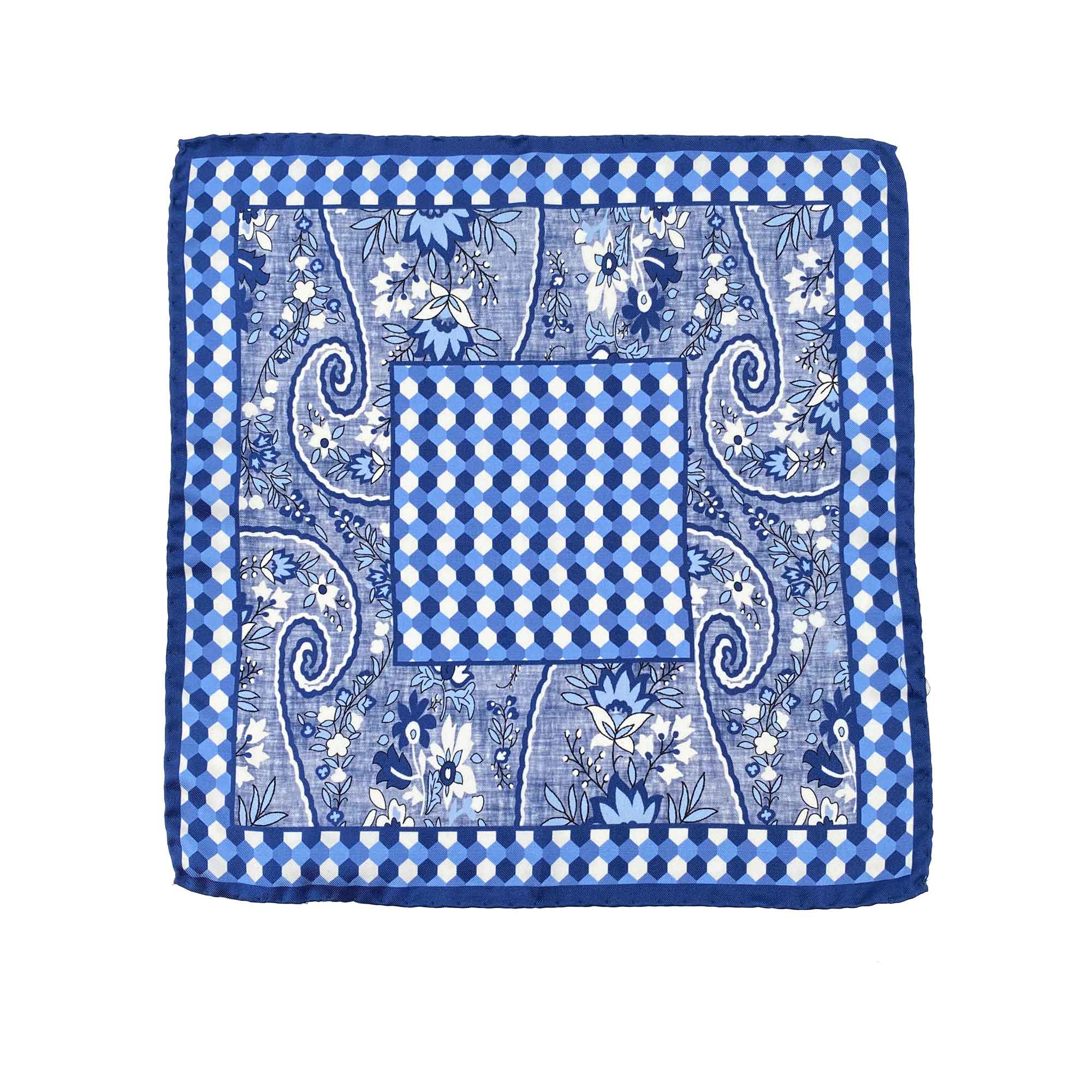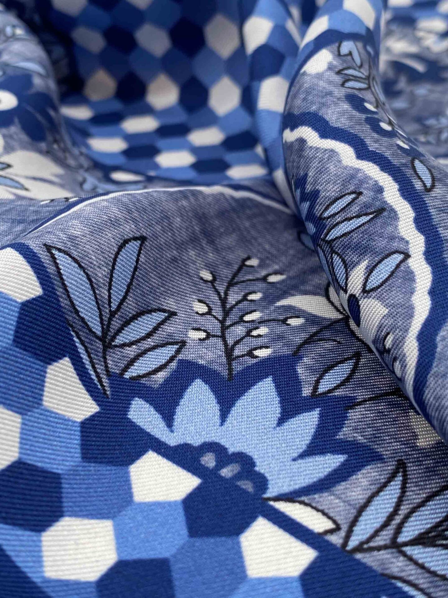 Pañuelo estampación hexágonos y flores en azules y blancos.
