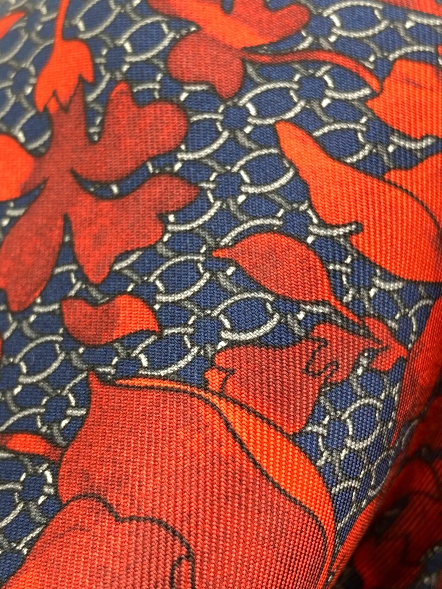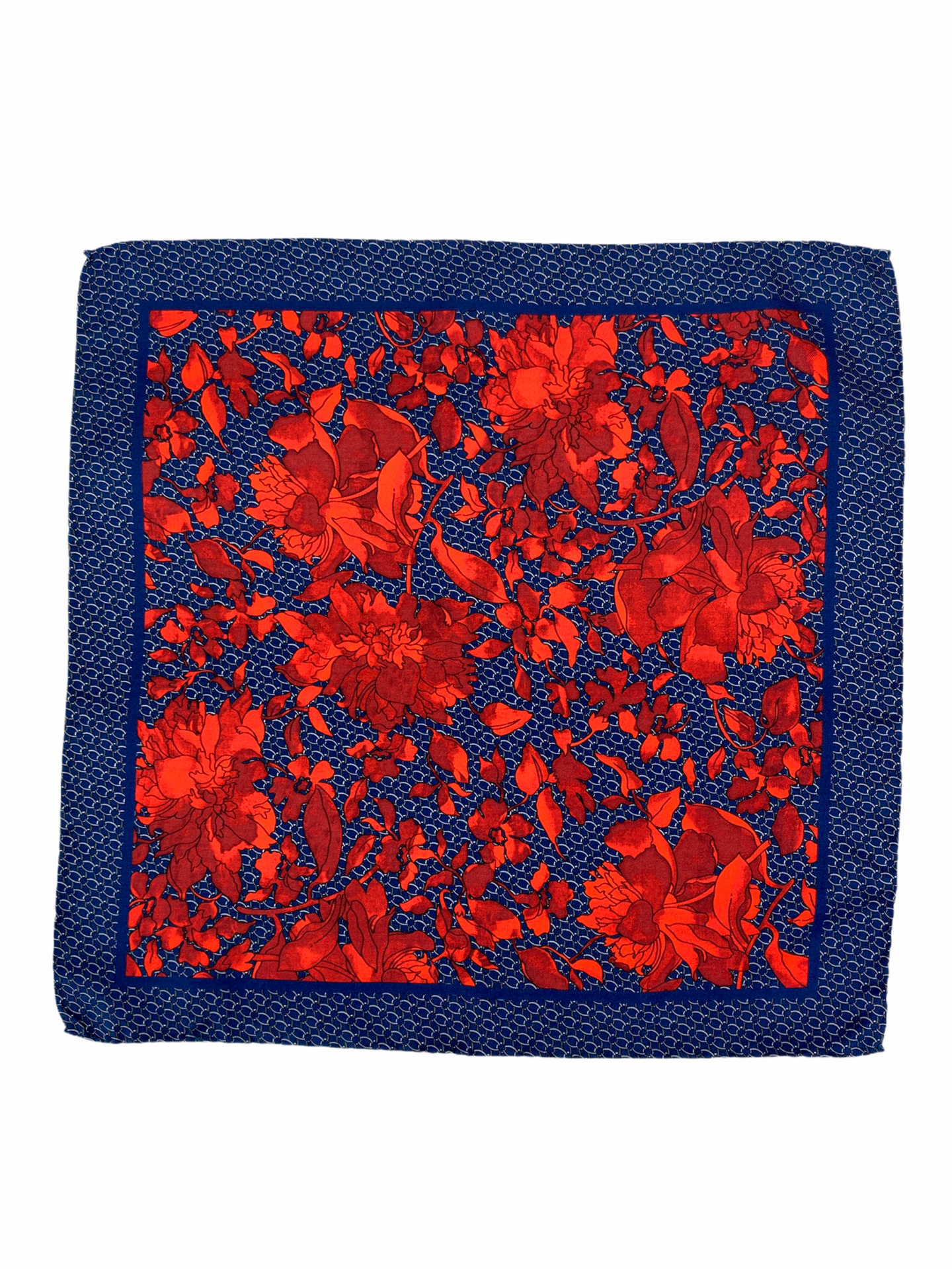 Pañuelo estampado con óvalos azul marino y flores rojas.