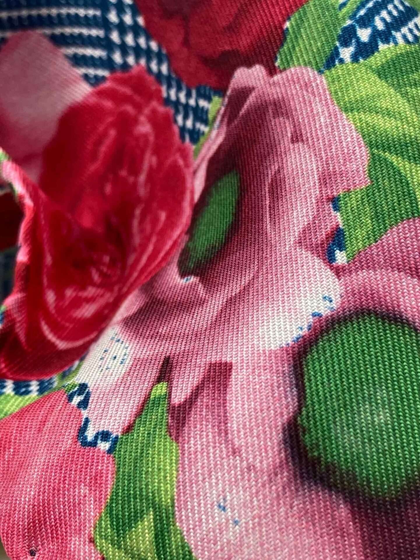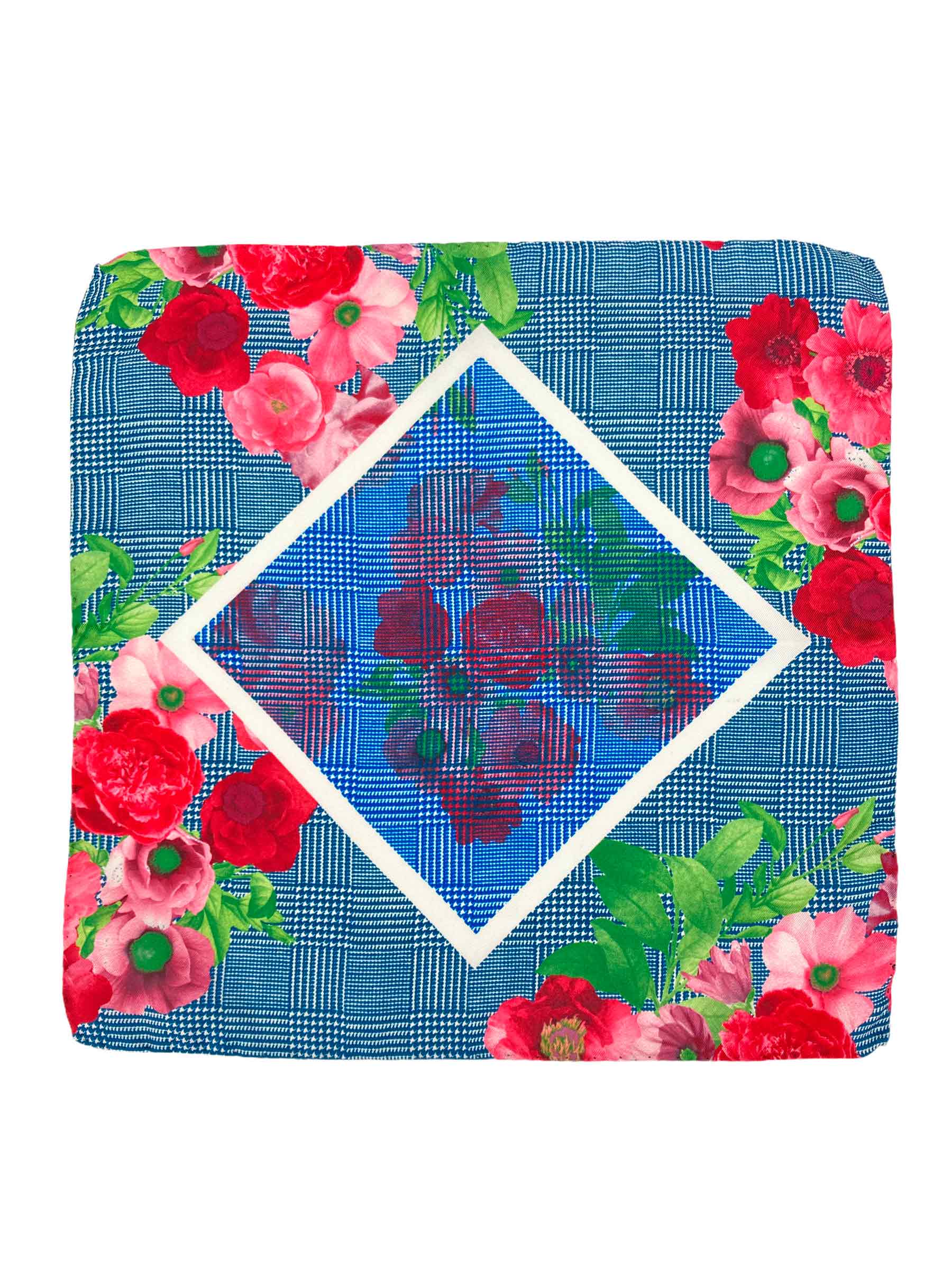 Pañuelo estampado en fondo de cuadros gales azules y flores rosas.