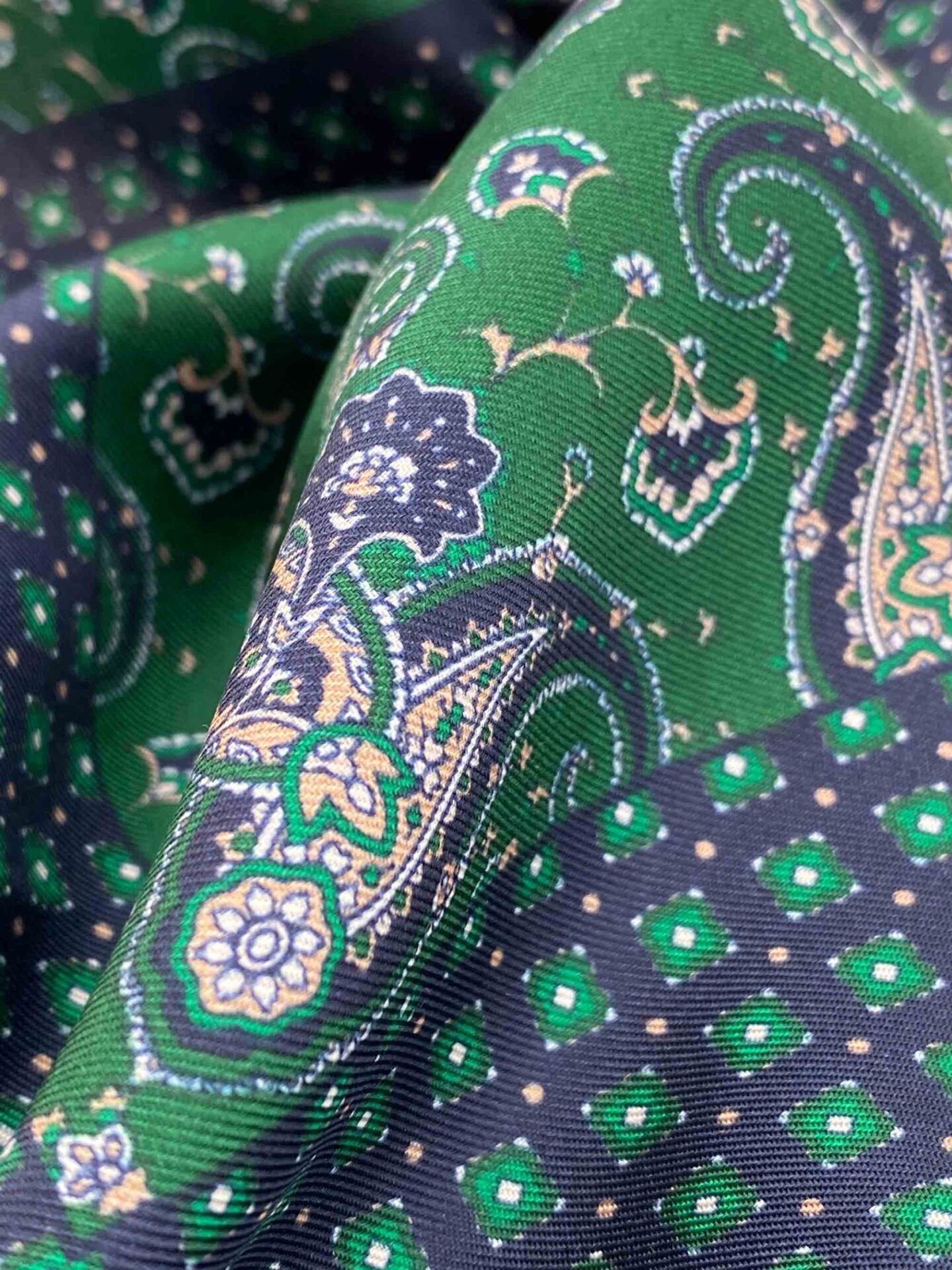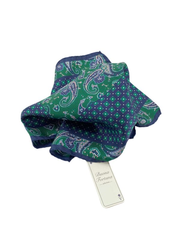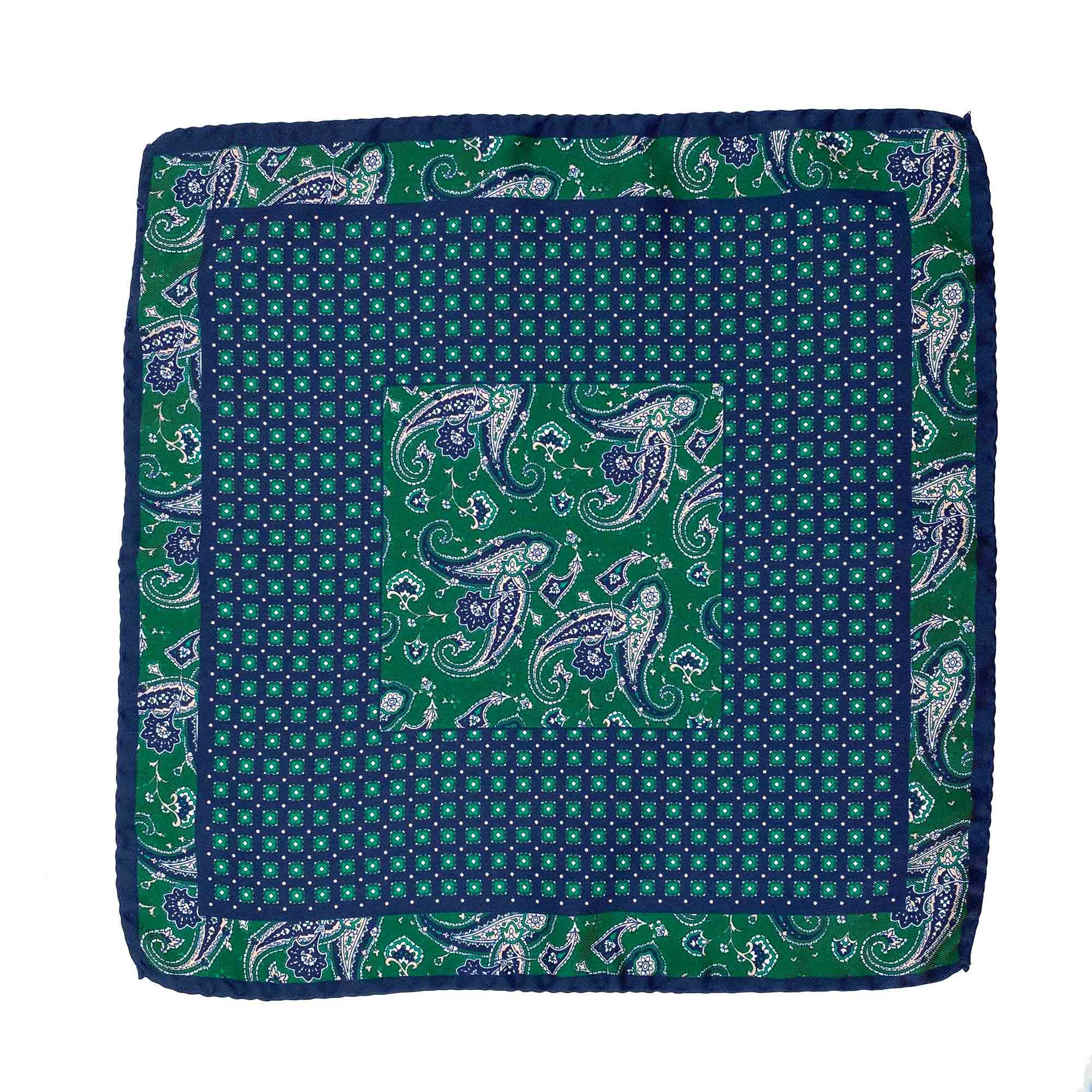 Pañuelo estampación en cashmeres y cuadrados verdes y fondo marino.