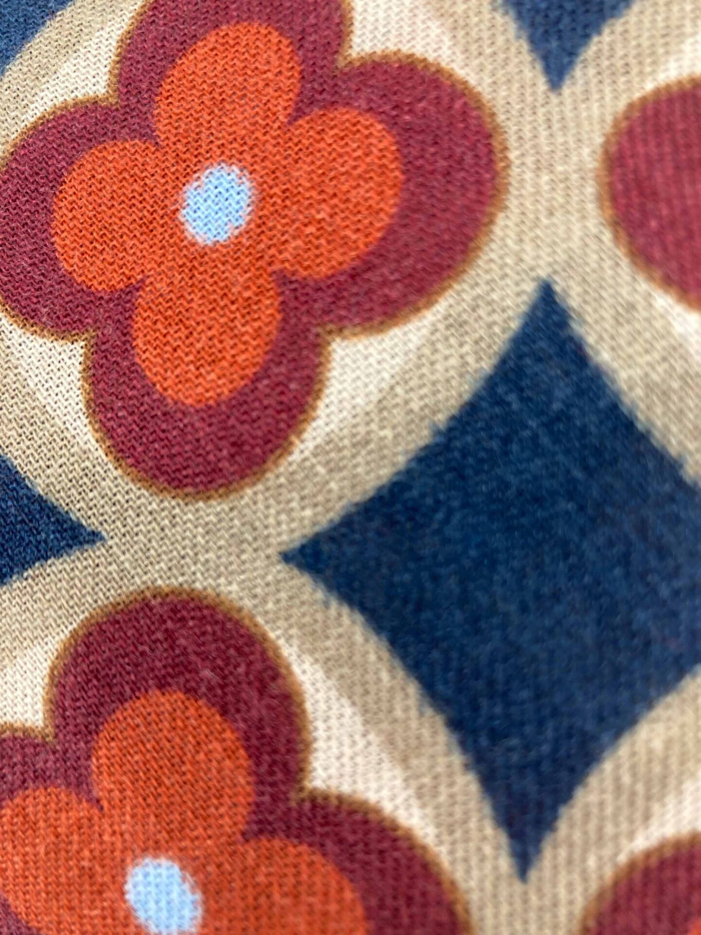 Pashmina de lana estampada, fondo marino y granate, combinada con flores jejas y granates.