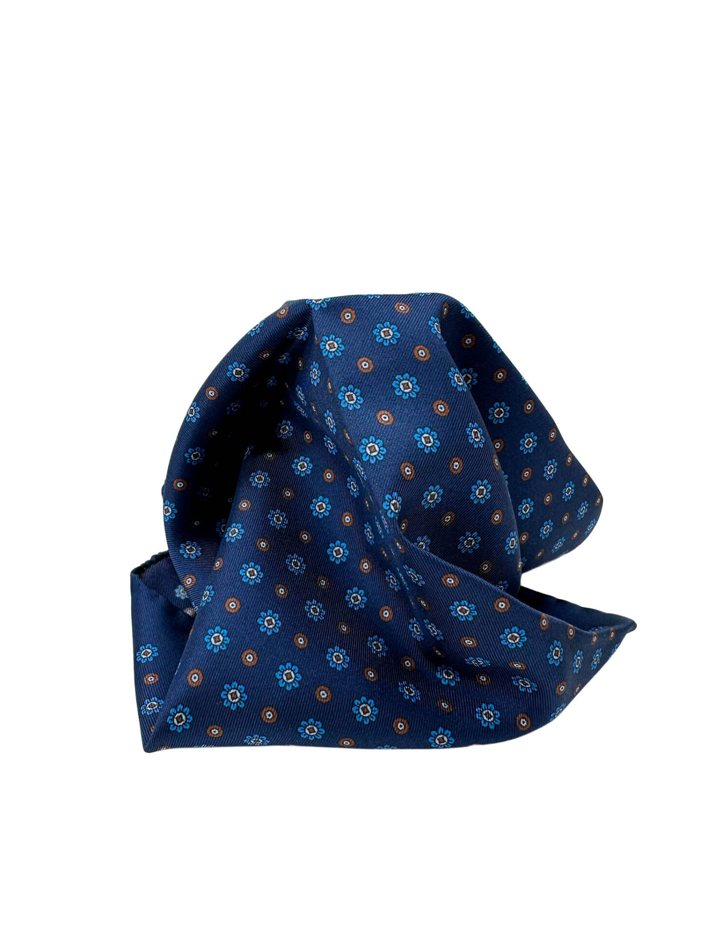Pañuelo de bolsillo azul marino con flores celestes, un clásico que no falla.