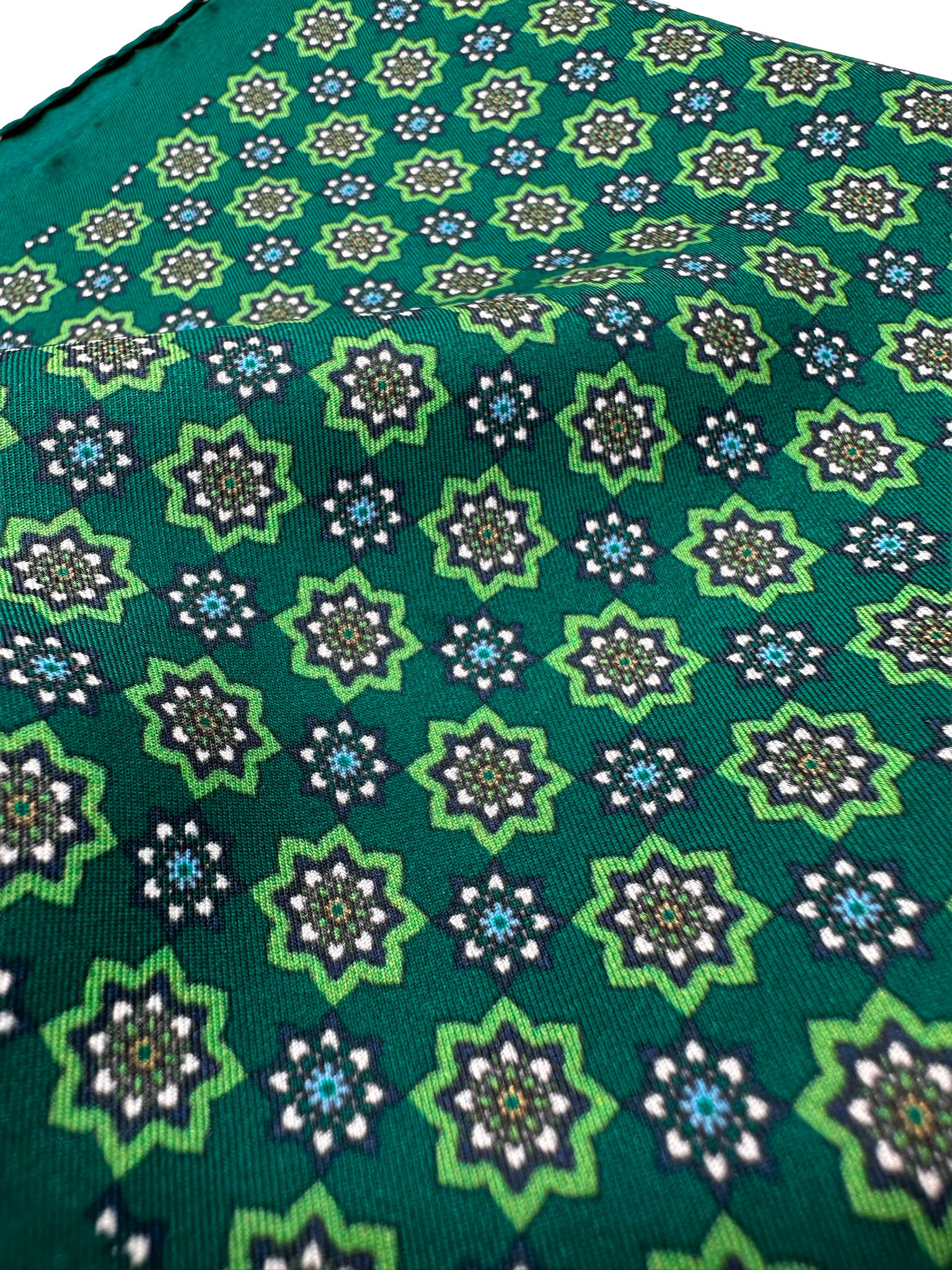 Pañuelo de bolsillo verde con motivos estrellados en blanco y azules.