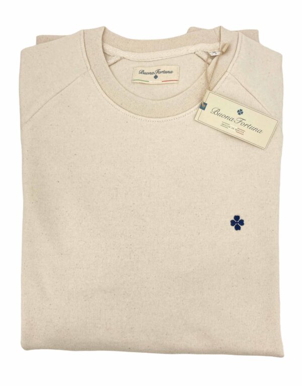 Sudadera sport confeccionada en algodón orgánico y materiales reciclados, color crudo natural con trébol bordado a contraste en azul marino, lleva la suerte contigo.