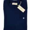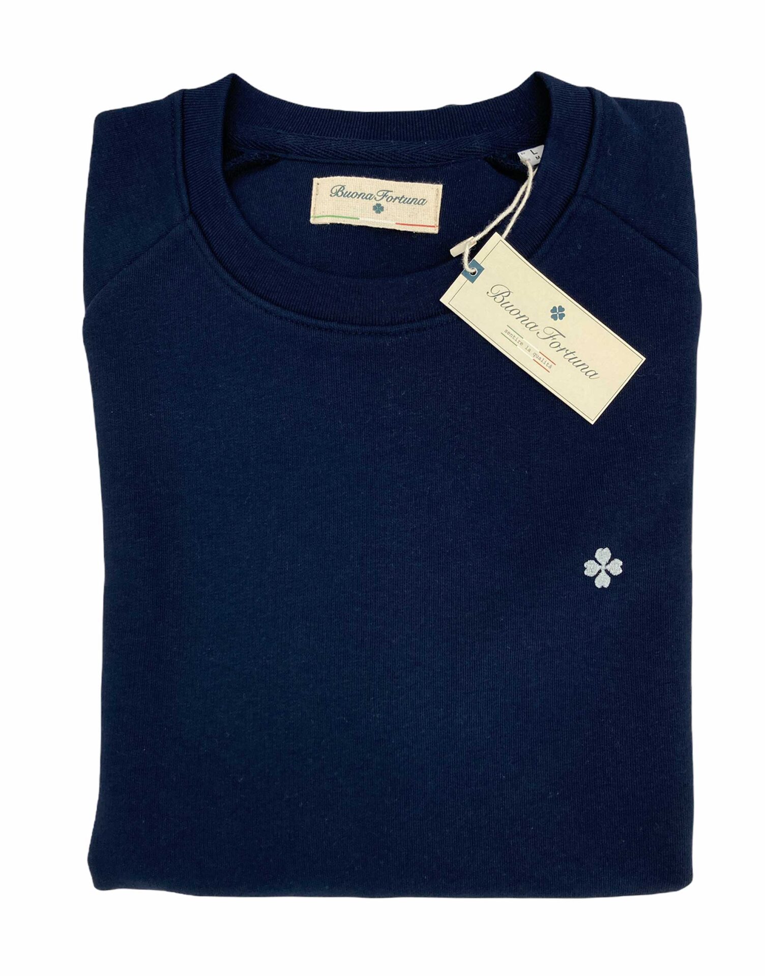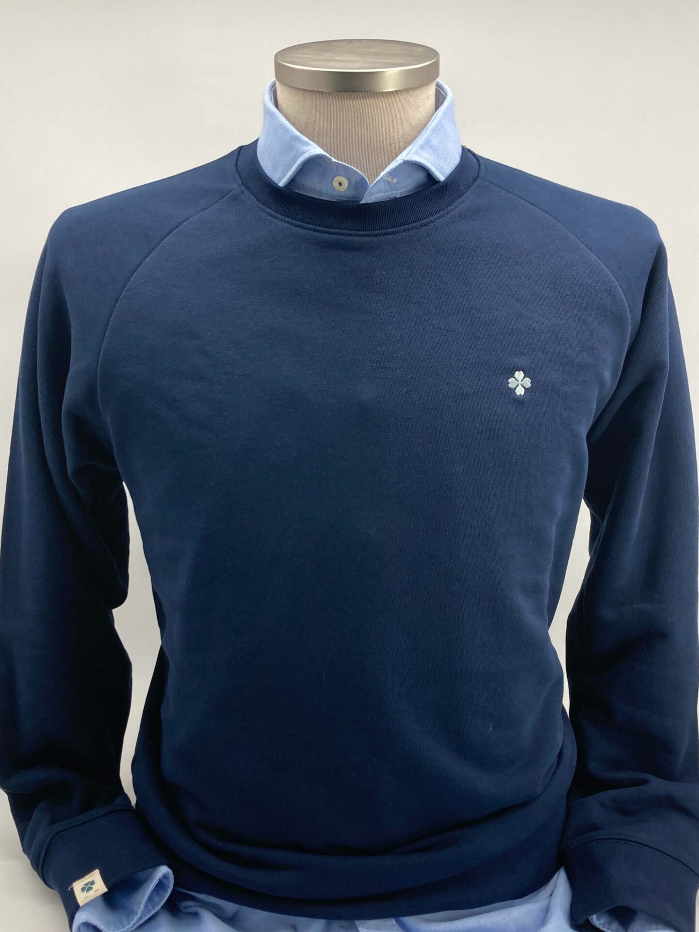 Sudadera sport confeccionada en algodón orgánico y materiales reciclados, color azul marino con trébol bordado a contraste en gris, lleva la suerte contigo.