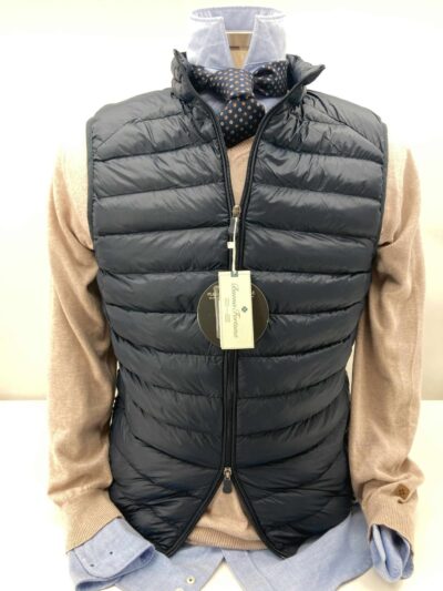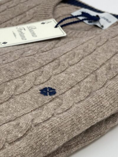Jersey cuello caja con trenzas y canalé, color azul marino y logo en azul celeste, ideal con camisas de oxford y cuadros, una nueva colección de Buona Fortuna que vuelve con mucha fuerza.